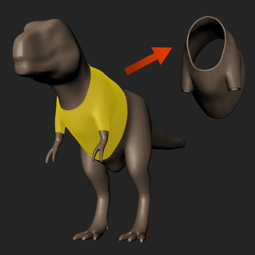 This tool creates a new mesh from the selected faces of one, or more, other meshes. It enables you to generate complex shapes that conform to the contours of other meshes. For example, you can use Mesh Extract to create clothing for your character.